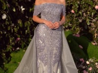 Silver Off-Shoulder Embellished Mermaid Gown with Sheer Overskirt
