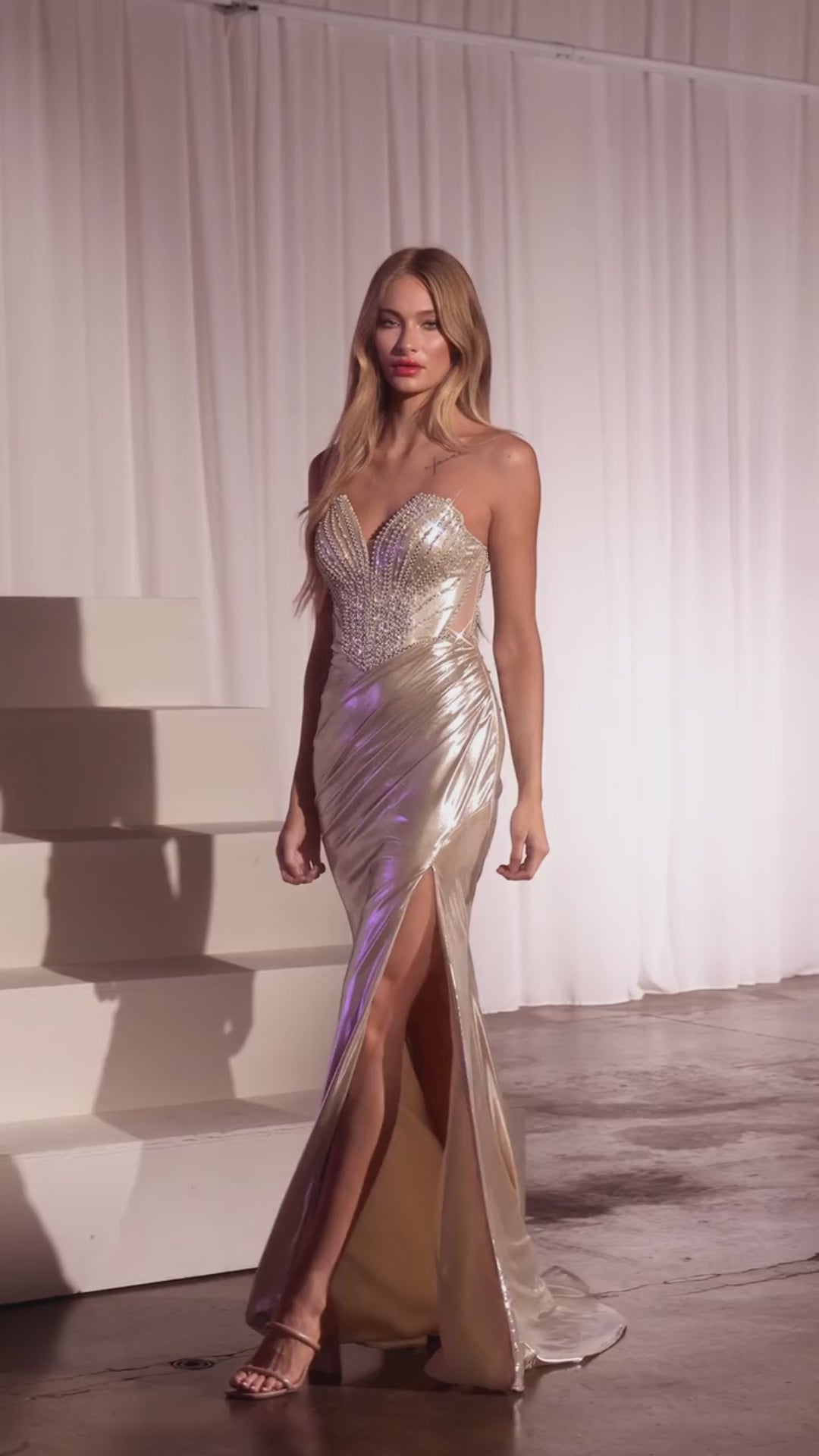 Shine like a true goddess in this dazzling Platinum Metallic Gown, designed for the woman who isn’t afraid to own the spotlight. The sculpted strapless bodice features a fully beaded crystal corset that radiates from the center out, creating a luxe hourglass effect that cinches the waist and flatters your curves.