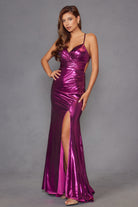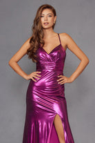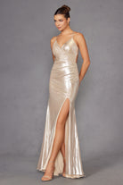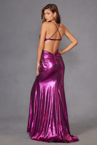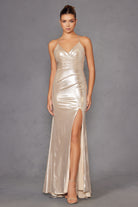 Elevate your evening wear with this stunning metallic dress. This piece features a halter neckline that gracefully transitions into a sleek, sleeveless design, accentuating the shoulders and allowing for an elegant display of the collarbones. The top is artfully ruched, creating texture and enhancing the silhouette, while the cinched waistline flatters the figure. The luxurious fabric cascades down into a flowing skirt with a daring thigh-high slit. The back of the dress is equally captivating, with crisscrossing straps that add a modern twist and a gathered design at the lower back, creating flattering ruching that enhances your curves. This dress is tailored to perfection with a smooth lining for comfort, ensuring you look and feel fabulous throughout any event.