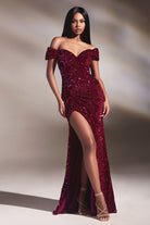 Red | Off-Shoulder Sequin Slit Gown – Sweetheart Neckline Formal Dress CDCA109