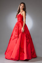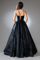 Elevate your formal look with this stunning ballgown that seamlessly blends effortless glamour and modern romance. Delicate lace appliques adorn the skirt, complemented by spaghetti straps and a scoop neckline for a touch of timeless allure.