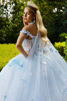 Step into your fairy tale moment with this ethereal powder blue princess ball gown, crafted for modern royalty. This dreamlike gown features a sheer corset bodice adorned with intricate 3D floral appliqués and shimmering sequins that cascade down into a voluminous tulle skirt. The off-the-shoulder design with delicate flower detailing adds a romantic, garden-inspired touch that evokes a Cinderella-worthy silhouette.