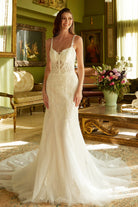 This timeless off-white lace wedding dress features a fitted silhouette adorned with delicate floral lace. The long flowing train adds elegance, making it ideal for brides seeking classic romance on their special day.