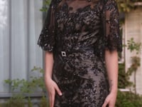 Turn heads in this show-stopping Black Sequin Lace Mermaid Gown with Cape Sleeves. Designed with intricate black sequin lace over a nude underlay, this figure-hugging dress features dramatic sheer cape sleeves, a belted waist for definition, and a voluminous glitter tulle mermaid skirt. The perfect choice for black-tie events, galas, or sophisticated evening occasions, this dress combines elegance with a bold statement.