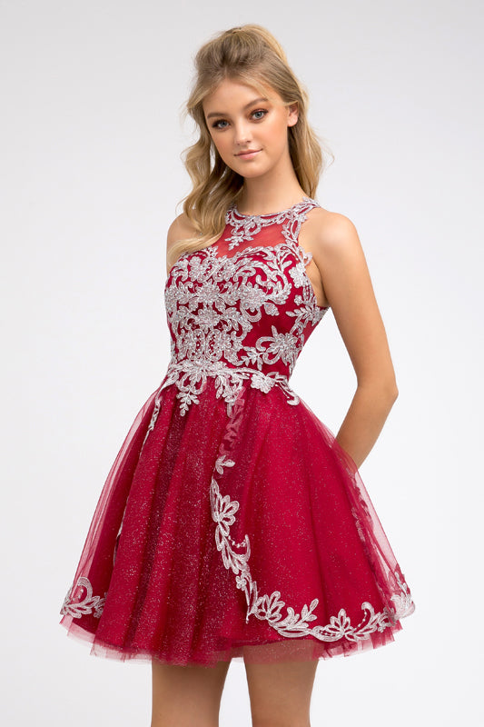 Embroidered bodice and tiered skirt short dress.