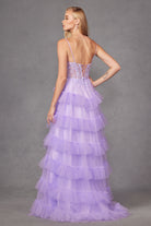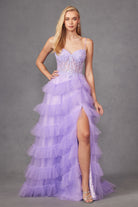 Fitted Beaded Gown With Tulle Ruffles And Skirt Slit Lace Corset Bodice Prom Dress. JT2459A