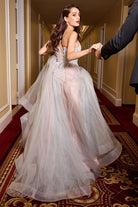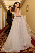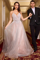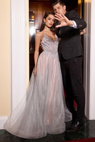 Silver Nude Glitter Tulle Ball Gown with Beaded Bodice and Plunge Neckline
