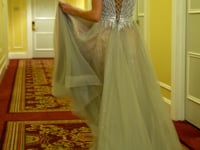 Step into luxury with this breathtaking silver nude glitter tulle ball gown. Designed to captivate, this gown features a deep plunge neckline adorned with intricate beaded detailing that flows into a voluminous, glitter-infused tulle skirt. The soft nude underlay creates a dreamy, ethereal contrast, while the sparkling silver overlay adds just the right amount of dazzle.