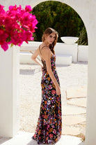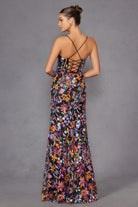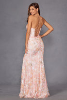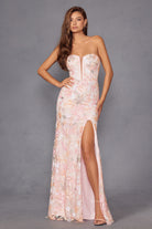 Embrace elegance with this breathtaking floral embroidered gown. Featuring a fitted corset covered with delicate pastel-colored floral embroidery on a sheer overlay, this piece radiates charm and grace. The structured bodice offers a flattering fit, while the floor-length skirt flows effortlessly, accentuated by a bold thigh-high slit for added allure. The back of the dress is equally stunning, with a gathered design that enhances the silhouette and adds texture. Ideal for formal occasions, this gown is sure to leave a lasting impression.
