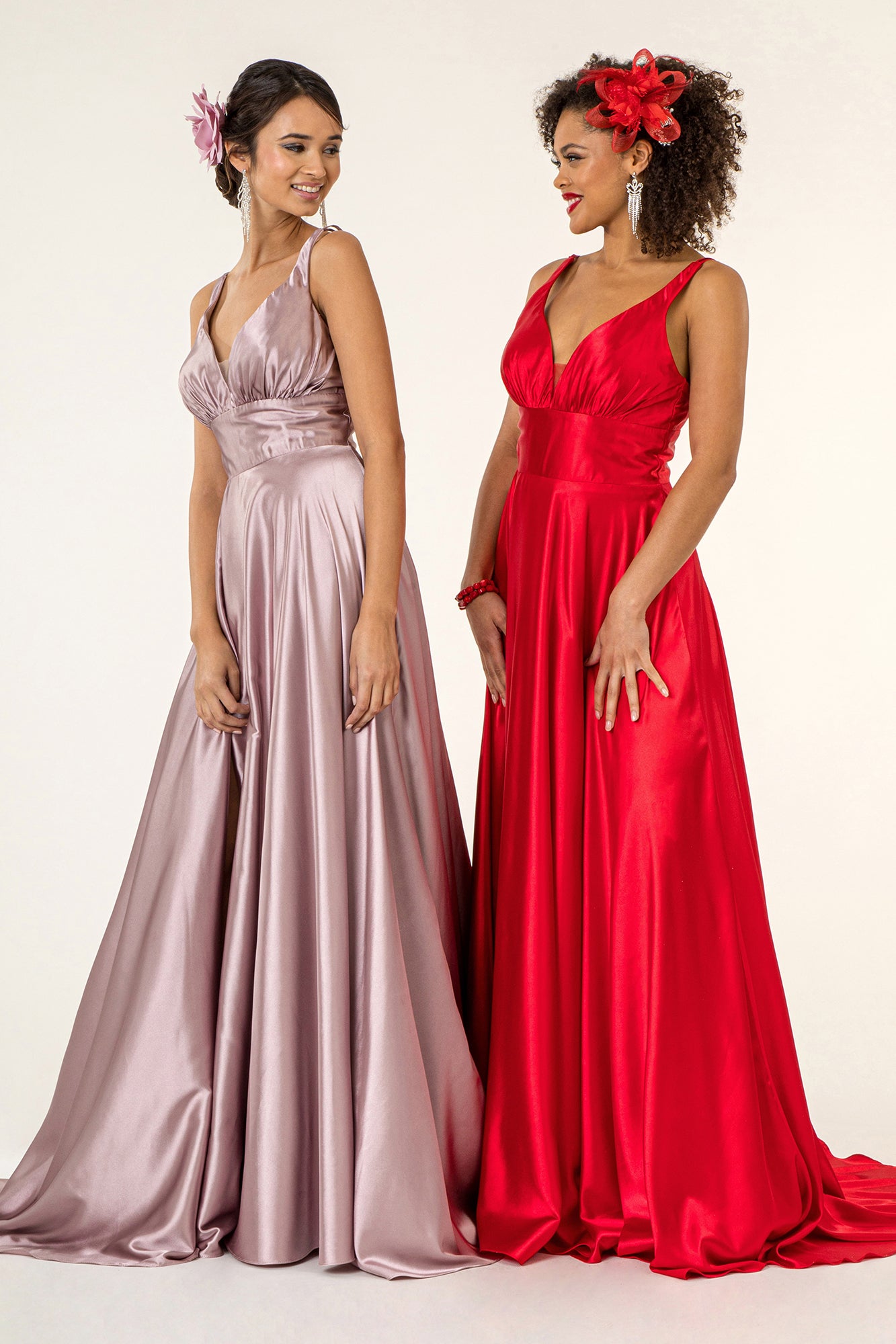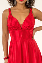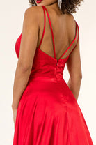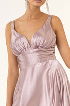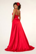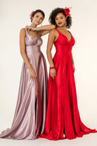 V-Neck Wide Waistband A-Line Satin Long Dress /w Slit - Mask Not Included GLGL2963